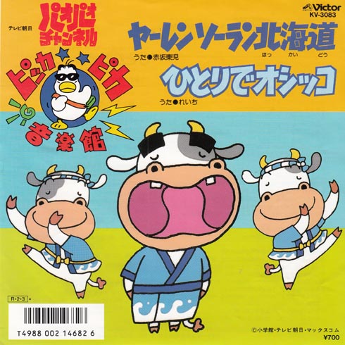 | 赤坂東児 ヤーレンソーラン北海道 テレビ朝日のパオパオチャンネルのピカピカ音楽館ってところでやっていたそうな。北海道の牛のうたっていうか語り?「あんたがた牛乳くらい飲んだことあるっしょ。だけどあれ、あたしら牛のおかげなんだよ。うっそでない。うっそでないって。うそでない。したっけ、いっかい見にくればいいべさ」っていう北海道弁でトークする歌ですね。でもすこーし北海道弁とはイントネーションが違うからさぁ、きっと道産子ではないと思われる。もう少し田舎の人に言わせたらよかったしょや。1987年だともうバーコードがついているんだなぁ。 |