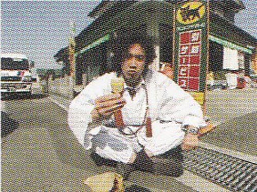 写真では道路に座っているように見えますが、そうではなくて、駐車場に入る小道ですね。後ろから車が来てますが、これは駐車場から出てくる車。そんなに轢かれるほどスピードもないと思われます。きっと近くにベンチがあったと思われますが、ほかの客がいたのでしょう。後ろの建物はお菓子とか売ってる雑貨屋さんの様です。