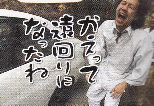 浄瑠璃寺に行く前に、大宝寺で杉の様にまっすぐありたい、と願ったがまだまだ寺は残っている。80まで行きたいので、近道作戦をとろうと。「これかい?これをどっちに?」と運転は洋さん。「右右」と藤やん。「また藤村くーん。またこういう道かい?これわかりやすいね、こっからあそこに行くんだね」藤やんが「ずっと大きい道で行けるよ」と言ったとたん。ガンガンと。「今一瞬言葉のんだね」「ガンって言ったもんね」「脱輪したよ僕今」しばらく行って「なんか変な音してないか?」「ちょっと見てみようか?」降りたら「あ!」「あれなんだろこれ?藤村君これなんだ?藤村君僕らもう死ぬんじゃないかこれ。藤村君こんな人の通らないところでだぁパンクっていうことはないだろう。藤村君」と絶望に落ち込む洋さんに向けて藤やんは「かえって遠回りになったね。」という。これは爆笑だよね