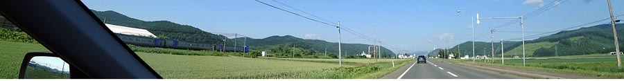 国道39号、相内から留辺蘂方向。写真左に見えるのはJR石北本線の札幌行き特急。