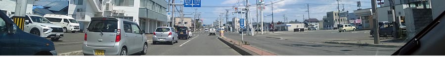 国道39号から左折で北2条通りへ。写真左は、西6丁目のはま寿司、写真奥が中央通り方向。