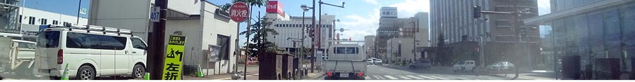 | 山下通り、学園通りの交差点。前方は東宝ビル、前の通りでは国道39号までの間で夏祭り。 |