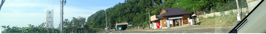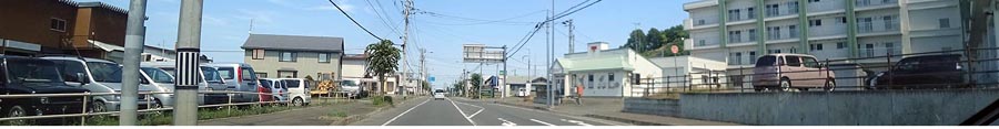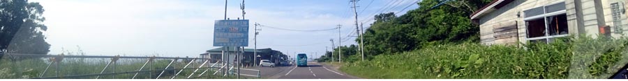 | 国道334号、斜里からウトロに向かう途中。写真は日の出バス停前。写真左がオホーツク海、 進行方向奥はオシンコシンの滝・ウトロ・知床峠。 |
