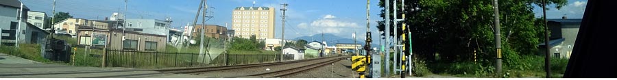 | 道々802号線、JR釧網線の踏切から斜里駅方向。写真奥は知床の山並み。 |