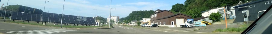 | ウトロ、道の駅前から知床峠方向。写真左、太陽光パネルの向こうに道の駅「シリエトク」。 |