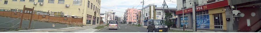 | 山下通り、かみむらキッズクリニック前から東宝ビル方向。前方右のピンクぽい建物はユニオンビル。 |
