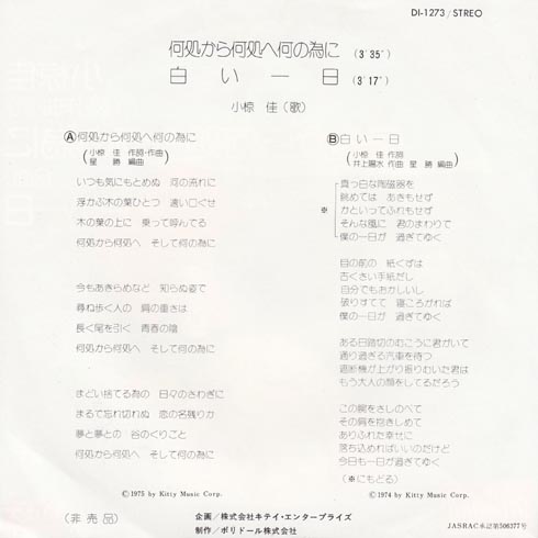 よく見たら左下に「非売品」って書いてありますので、調べましたら、トリンプという下着メーカーの宣伝用のレコードだったようです。B面の白い一日は井上陽水さんの作曲ですね。陽水さんの「氷の世界」に入っていますし、小椋佳さんはこのレコードの前の年にシングルで切ってます。なので、B面も名曲な販売促進レコードでした。
