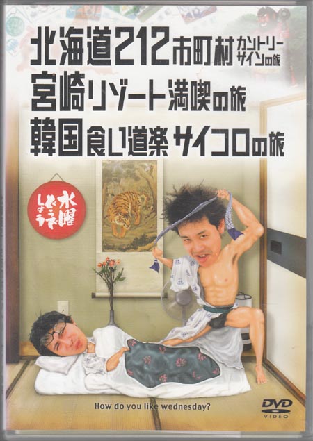 | 水曜どうでしょうDVD第5弾 北海道212市町村カントリーサインの旅と宮崎リゾート満喫の旅と韓国食い道楽サイコロの旅が入っている。藤やんも裏の解説に「谷間の三作」と書いてある。その通りです。見なくてもいい。特に韓国。韓国に行くまでが楽しくてあとは苦行。藤やんも後年「つらいだけでは楽しくない」と分かったという。表紙の絵は虎退治ですね。この時おならをするのは総集編だったという。DVDにははいっています。それにしてもいつも寝てるミスター。面白くないと思ったのかなぁ。でも起きると洋さんと藤やんのテンションに合わせなくてはならないからそれもつらいかぁ。 |