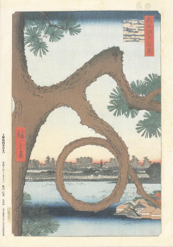 上野公園にあった「月の松」だそうです。丸くなっているのが満月ということでしょうなぁ。広重さんはもう1枚この木を描いていますが、これはまた後日。今でもこういう風に丸くなる松は現在でも上野公園に存在するそうですが、この木自体は明治の台風で折れたそうです。残念ですね。街並みの中に火の見櫓がそびえたつのがいいですね。
