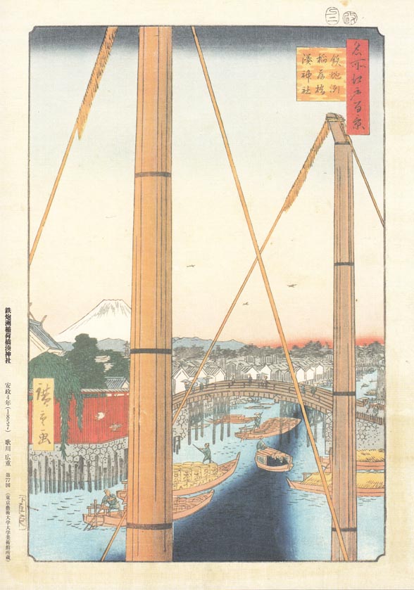 鉄砲洲稲荷神社は東京都中央区湊に現在でもあるそうです。赤い塀があるところですね。画面前面の太いぼっこは、千石船の柱だそうです。弁才船ともいうそうな。大きな帆を張って進む江戸時代の船ね。あれの柱。積み荷はお酒ですね。酒樽が真ん中の小舟に積まれてますもんね。この奥が八丁堀だそうです。ずいぶん富士山が近くに見えますけどね。それがいいんですね。