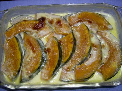 耐熱容器にバターを薄くぬり、薄切りしたかぼちゃを並べる。 |
